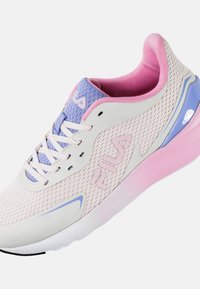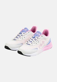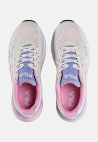 Baskets blanches et roses avec une tige en maille, des accents violets et une semelle intermédiaire texturée. Elles comportent des lacets et un logo Fila sur le côté.