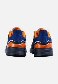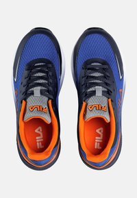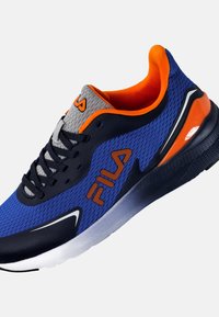 Chaussure de sport bleue avec une tige en mesh respirant, des accents orange, une languette grise, des lacets noirs et une semelle intermédiaire blanche ; arborant le logo Fila.