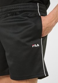 Homme portant un short de sport noir, des chaussettes blanches montantes et des baskets blanches FILA, se tenant devant un fond uni.