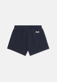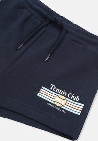 Shorts à cordon bleu marine avec l'inscription "Tennis Club" et un logo rayé sur la jambe droite, style sportswear décontracté.