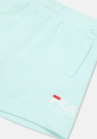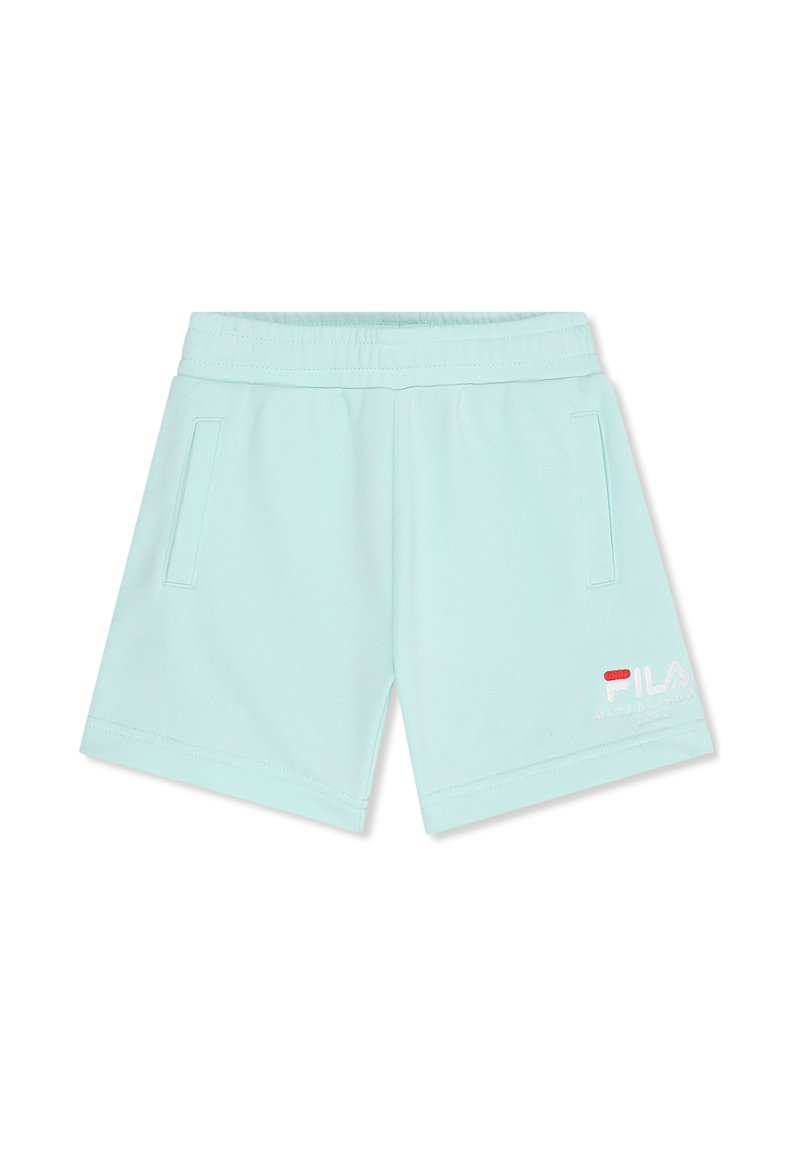 Shorts décontractés bleu clair avec une taille élastique, des poches latérales, et un logo FILA blanc et rouge sur la jambe droite en bas.