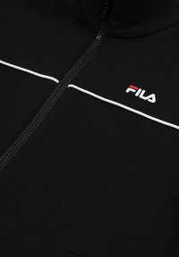 Ensemble veste zippée noire FILA et pantalon assorti avec un liseré blanc et de petits logos FILA sur la poitrine et la cuisse.