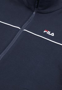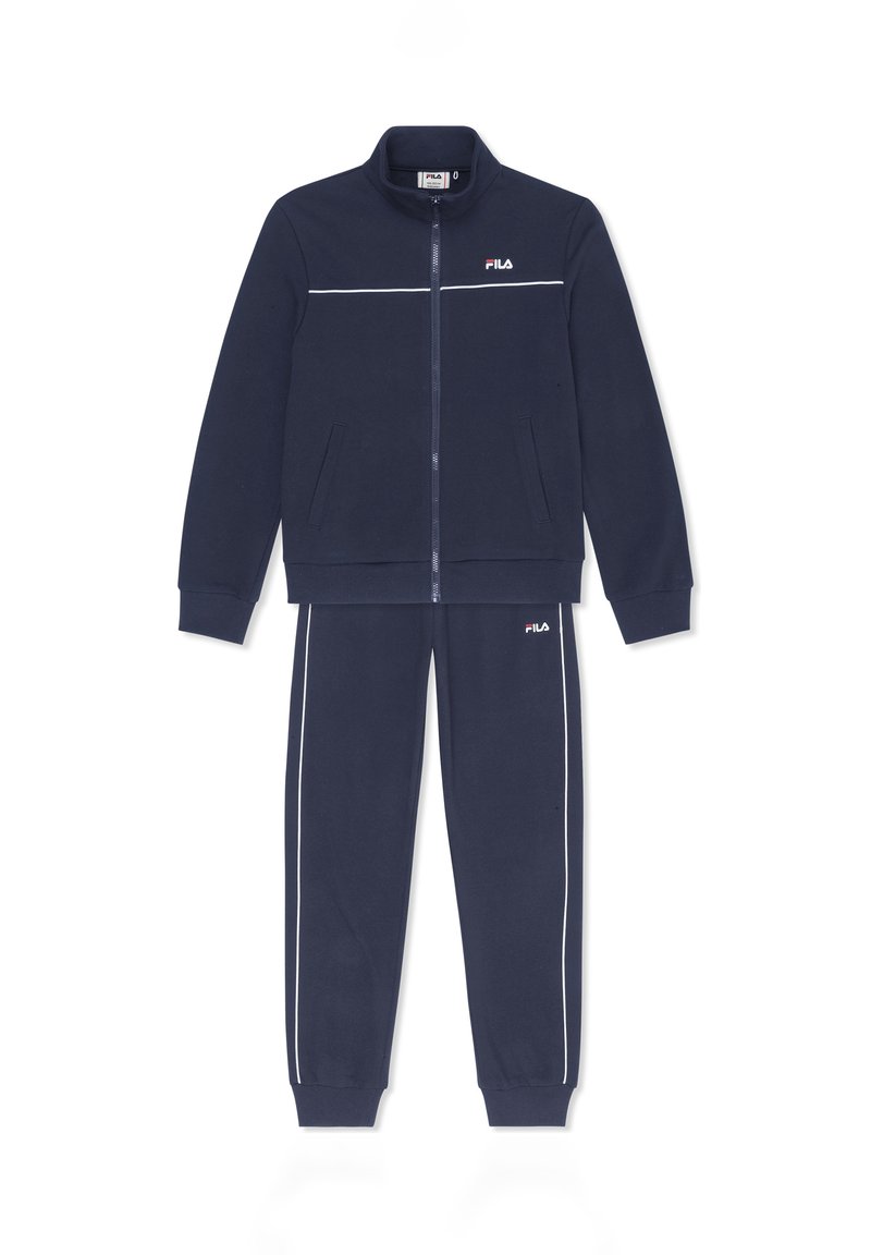 Survêtement FILA bleu marine avec veste zippée intégrale, passepoil blanc traversant la poitrine et les jambes du pantalon, et poignets élastiques aux manches et au bas du pantalon.