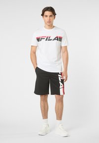 Jeune homme portant un t-shirt blanc FILA avec logo rouge et noir et un short noir FILA avec lettrage rouge et blanc, debout devant un fond uni.