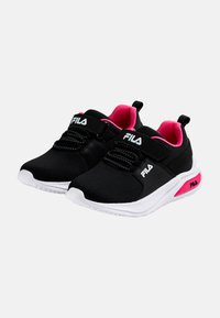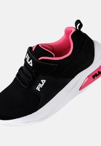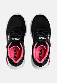 Baskets FILA noires et roses avec semelle blanche, bride velcro et logo sur le côté et le talon, vues de côté gauche.