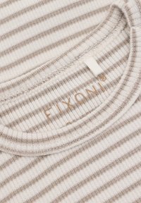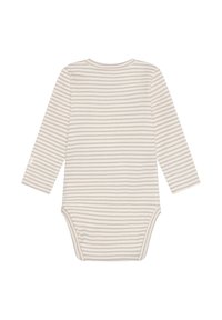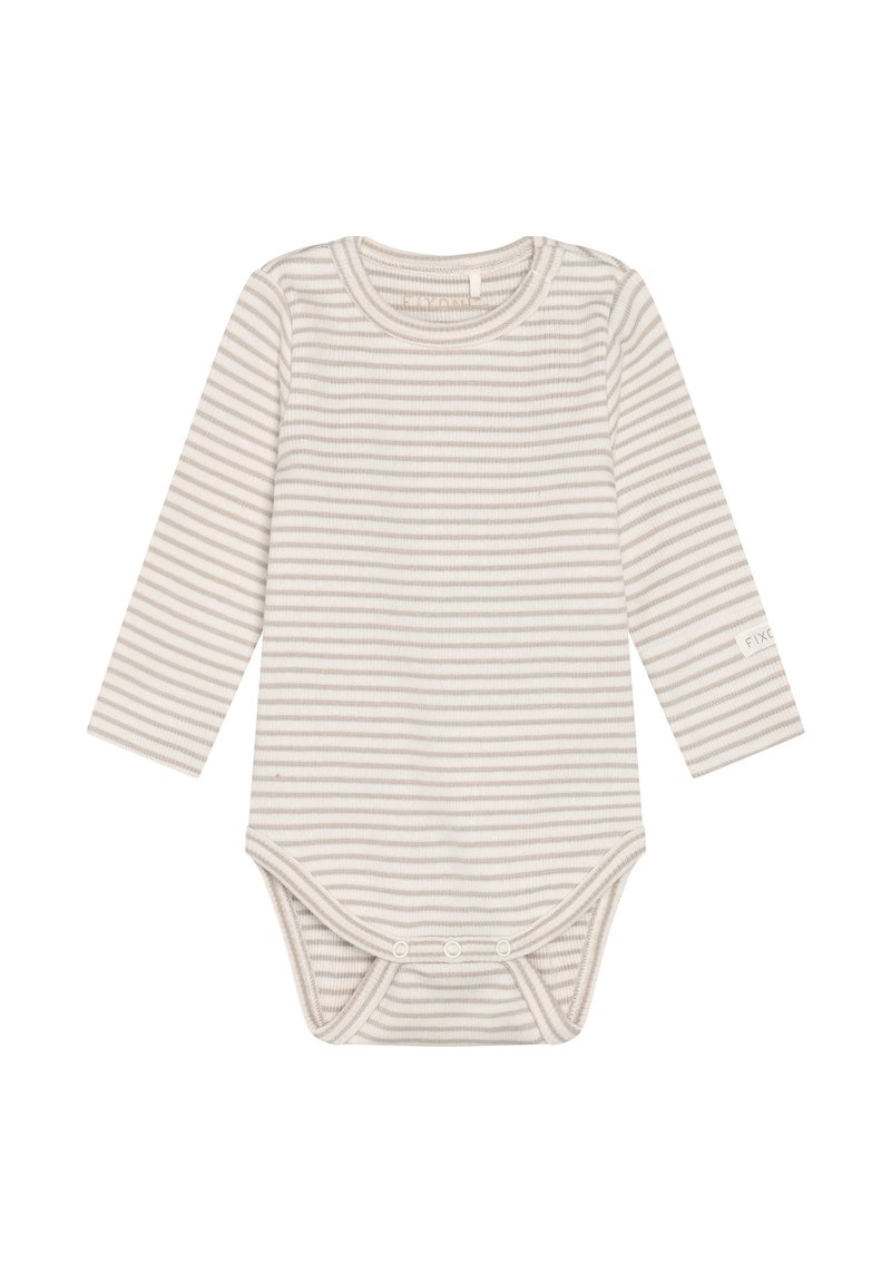 Body bébé à manches longues en tissu beige clair avec de fines rayures horizontales, doté d'un col rond et de boutons-pression à l'entrejambe.