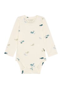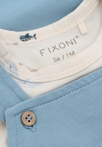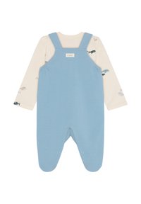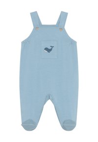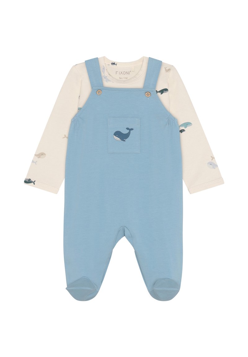 Salopette en coton bleu avec des bretelles à boutons et une poche avant ornée d'un motif de baleine. En dessous, un t-shirt à manches longues crème avec de petits motifs de poissons.