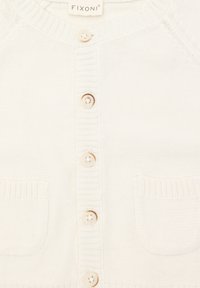 Cardigan beige clair à bords côtelés porté sur un body couleur sable orné d'un motif d'ours brun, mettant en valeur des tissus doux et des textures subtiles.