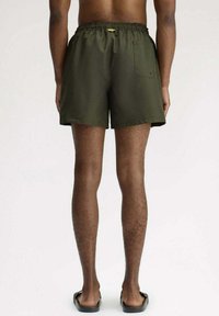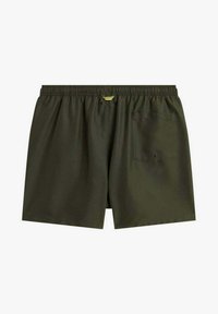 Shorts de bain vert foncé avec taille élastique et cordon, portés par un homme torse nu, affichant un petit logo de laurier jaune sur la jambe gauche.