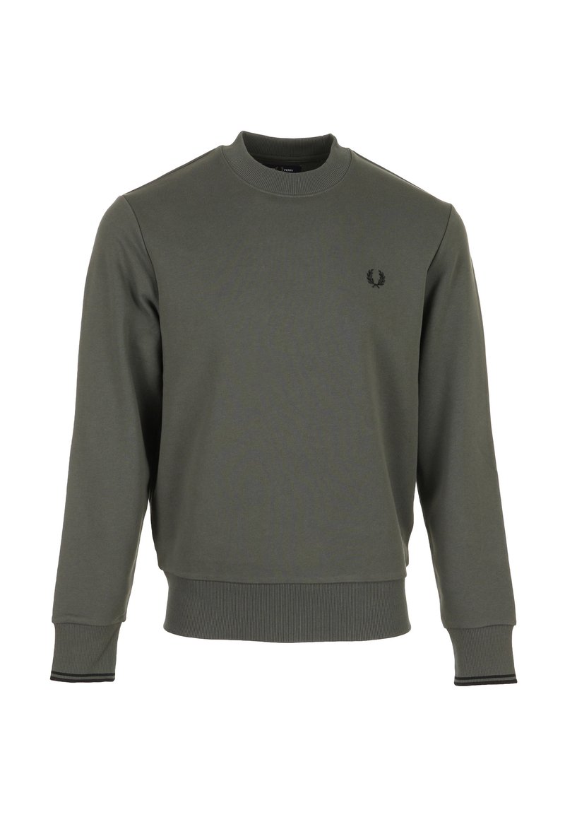Sweat-shirt vert olive à manches longues avec col rond, poignets et ourlet côtelés, avec un petit logo couronne noir brodé sur la poitrine.