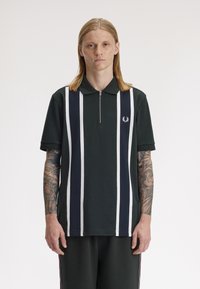Jeune homme aux cheveux longs et aux bras tatoués portant un polo noir avec des rayures verticales blanches et bleu marine, debout devant un fond uni.