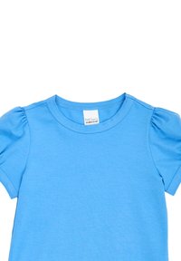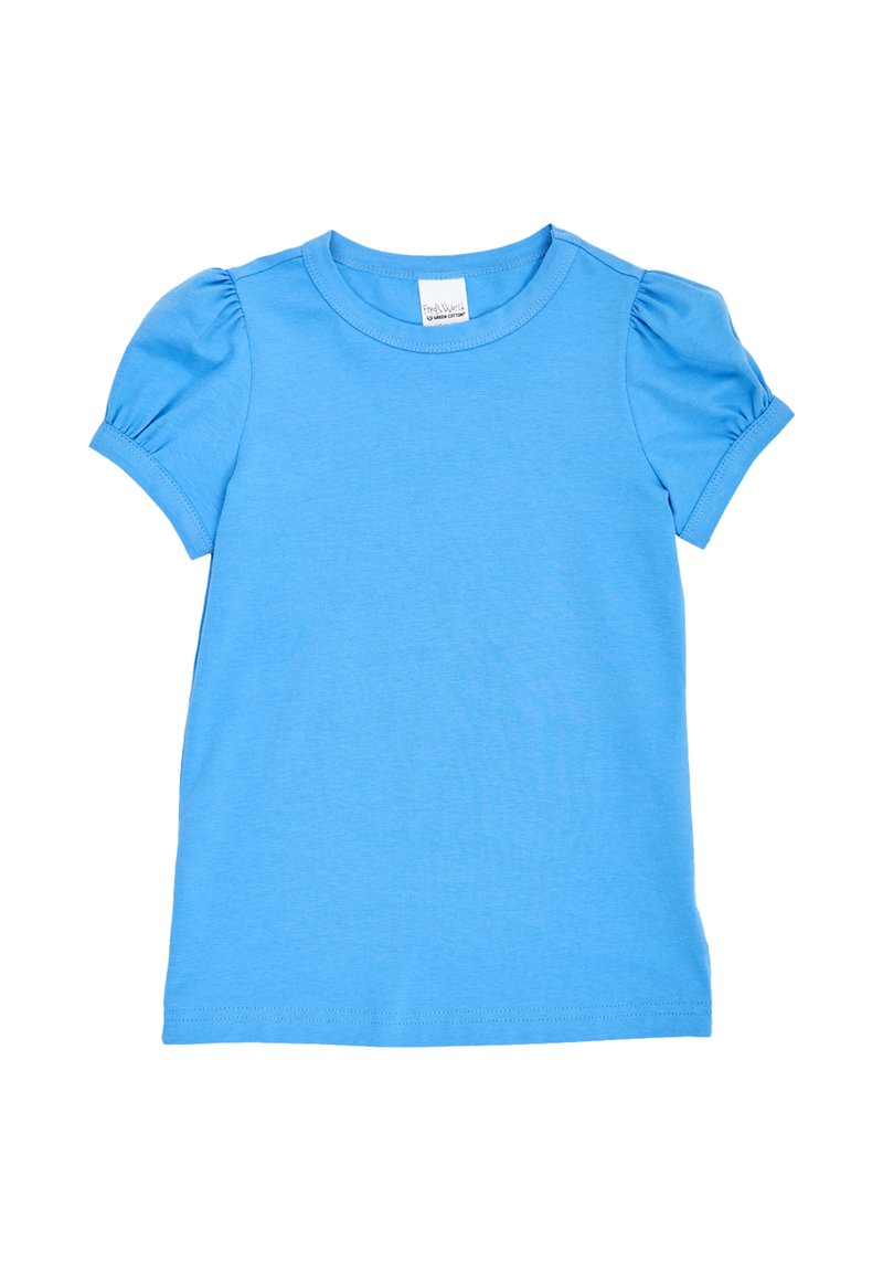 Chemise pour fille bleu clair uni à manches courtes avec manches bouffantes et encolure ronde, présentée à plat sur fond blanc.