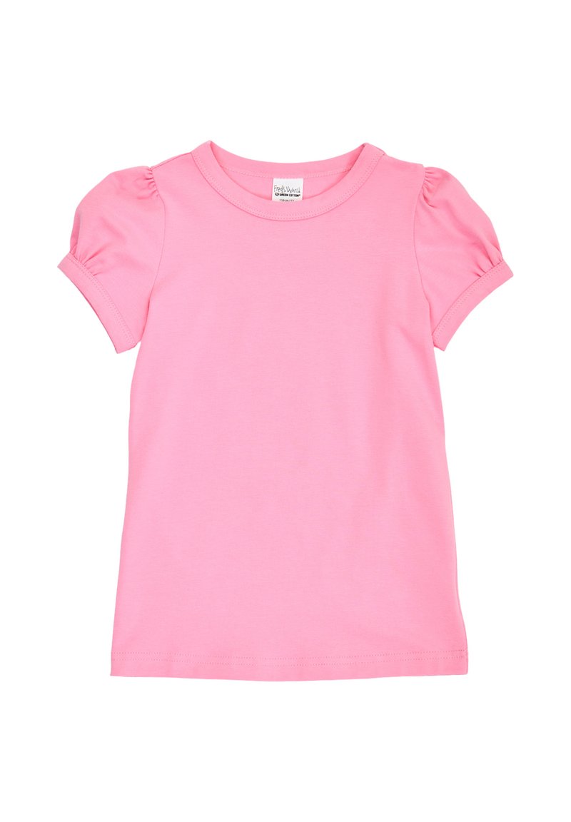T-shirt rose à manches courtes pour enfants avec épaules bouffantes et encolure ronde sur fond blanc.