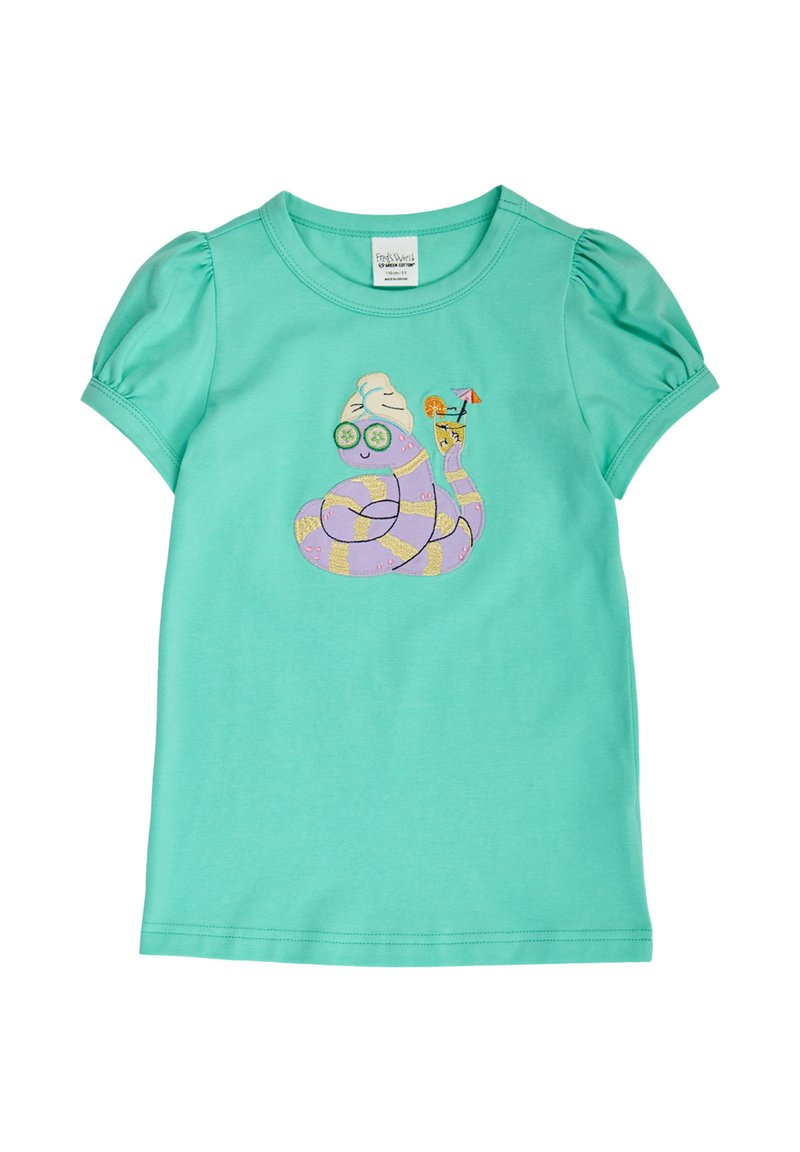Chemise turquoise à manches courtes pour enfants avec épaules bouffantes, représentant un serpent de dessin animé portant des masques pour les yeux au concombre et tenant un cocktail.
