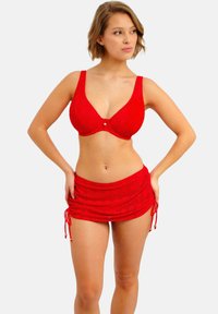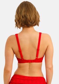 Soutien-gorge en dentelle rouge avec un motif géométrique, un décolleté plongeant, des bretelles larges et un ornement central doré décoratif.