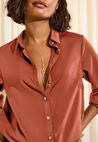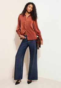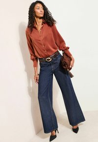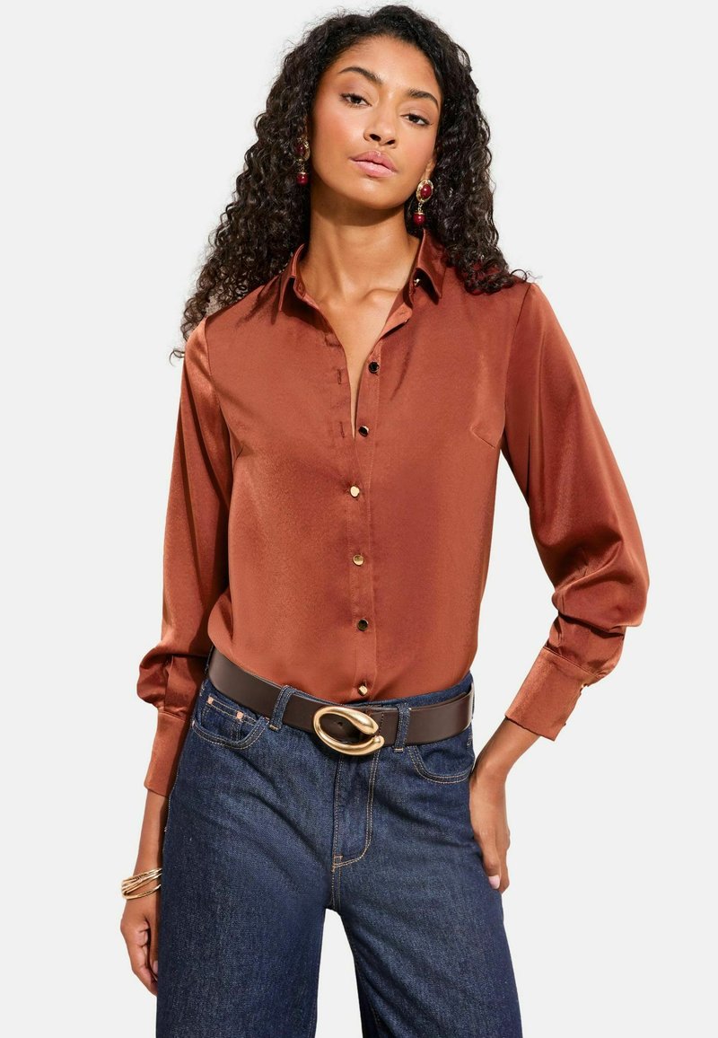 Femme aux cheveux bouclés portant un chemisier en satin couleur rouille, un jean bleu foncé, une ceinture noire avec une boucle dorée, et des boucles d'oreilles rouges.