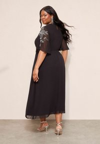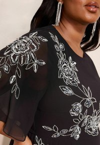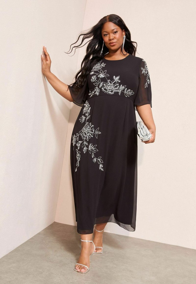 Robe en chiffon noire avec broderie florale argentée. Manches courtes, longueur jusqu'aux chevilles, associée à des talons argentés à brides et une pochette.