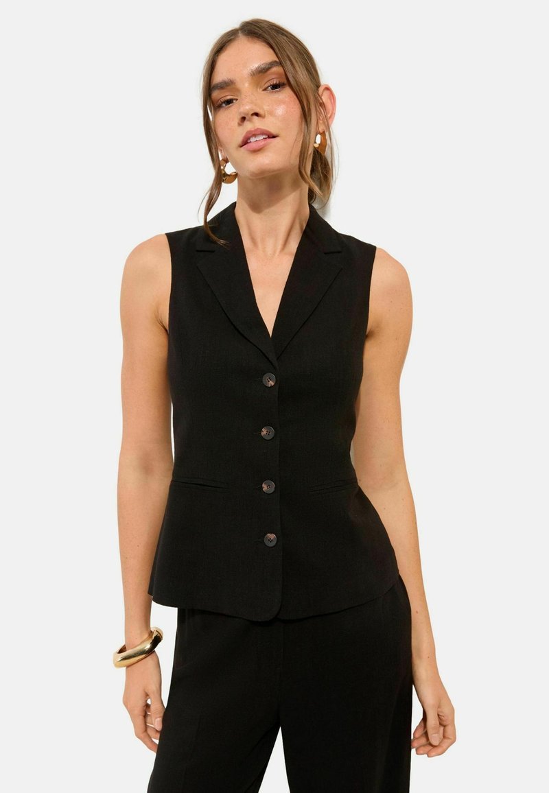 Femme portant un gilet noir sans manches boutonné et un pantalon noir assorti, accessoirisée avec des boucles d'oreilles créoles en or et un bracelet en or massif.
