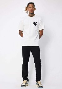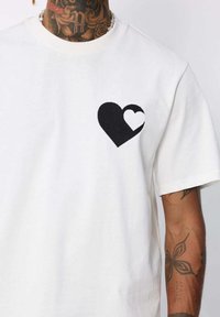 T-shirt en coton blanc avec un motif de cœur noir sur la poitrine gauche. Manches courtes, col rond et coupe décontractée.