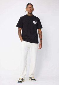 Homme avec des tatouages portant un t-shirt noir avec un cœur blanc et un plus petit cœur noir à l'intérieur, associé à un pantalon blanc, sur un fond uni.