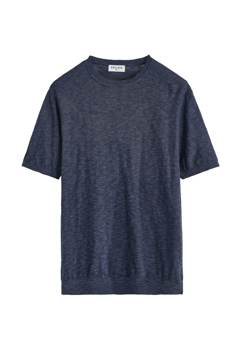 T-shirt tricoté bleu marine à manches courtes avec col rond et texture subtile, présenté sur un fond blanc.