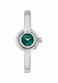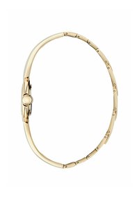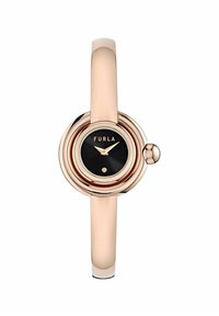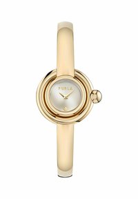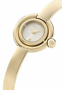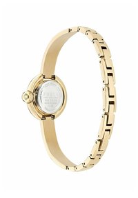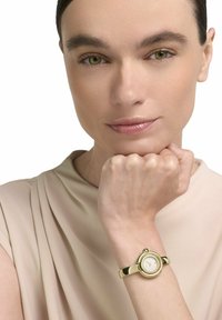 Femme aux yeux verts et à la peau pâle, reposant son menton sur son poing, portant un haut beige sans manches et une montre-bracelet ronde en or au poignet gauche.