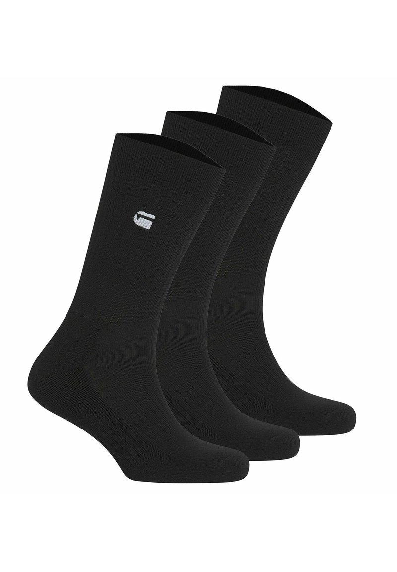 Trois chaussettes noires de type sportif avec un petit logo blanc sur le côté, présentées debout et alignées en rangée.
