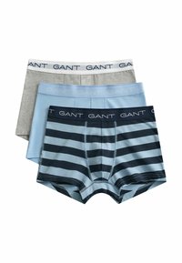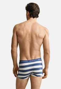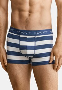 Homme musclé debout de face, portant un boxer bleu et blanc à rayures horizontales avec une ceinture à logo GANT, sur fond blanc.