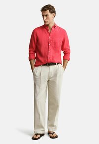 Jeune homme portant une chemise rouge vif à boutons avec les manches retroussées et un pantalon blanc avec une ceinture noire tressée, debout avec une main dans la poche.