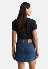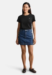 Femme portant un t-shirt noir avec un petit logo et une jupe en jean bleue avec des boutons dorés sur les côtés avant.