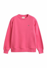 Sweat-shirt rose avec un col rond, des poignets côtelés, une coupe décontractée et un petit logo sur la poitrine. Porté avec un jean en denim foncé.
