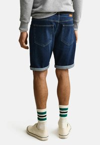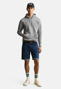Homme portant un short en denim foncé roulé, un sweat-shirt gris, des chaussettes blanches rayées, des baskets blanches et une ceinture noire avec des accents en cuir marron.