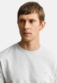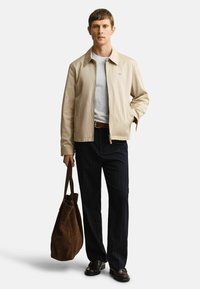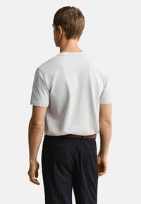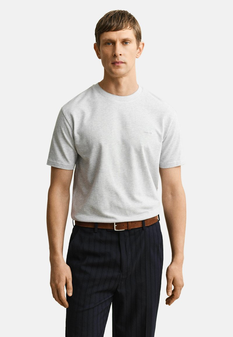 Homme portant un t-shirt à manches courtes gris clair rentré dans un pantalon rayé foncé avec une ceinture marron, se tenant devant un fond uni.