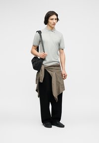 Jeune homme aux cheveux foncés portant un polo à manches courtes gris clair et un pantalon noir, debout devant un fond clair uni.