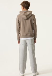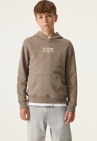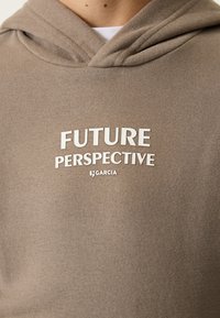 Sweat à capuche marron avec le texte « FUTURE PERSPECTIVE », poche avant ; associé à un jean large gris clair et des baskets blanches. Fond uni.