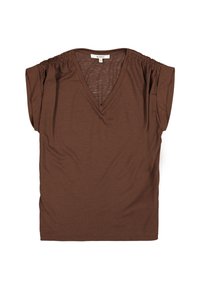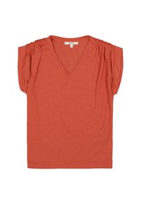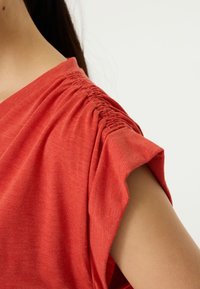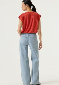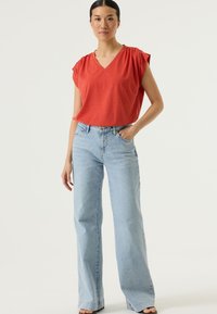 T-shirt rouge à col en V avec manches courtes, texture douce et coupe décontractée, associé à un jean en denim bleu clair avec poches avant.