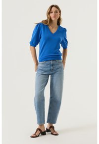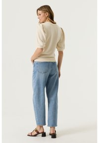 Femme debout, les mains dans les poches, portant un haut crème à manches bouffantes et col en V, un jean taille haute bleu clair, et des sandales à talons marron.