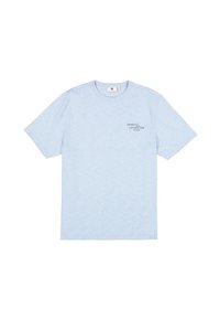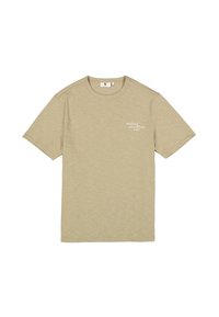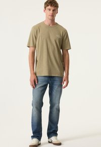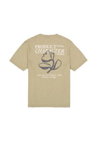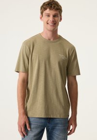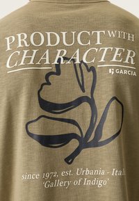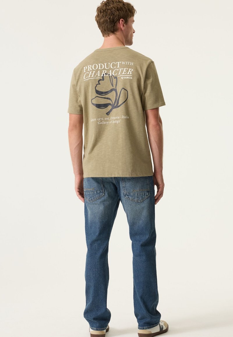 T-shirt en coton vert olive avec texte graphique et motif floral dans le dos, associé à un jean en denim bleu et des chaussures marron.