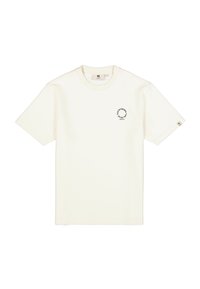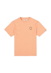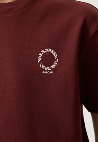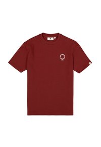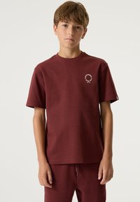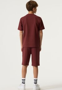 T-shirt col rond bordeaux avec logo, assorti à un short assorti. Des baskets blanches et des chaussettes noires et blanches à motifs complètent la tenue.