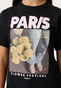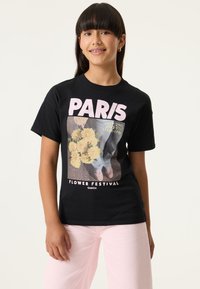T-shirt noir avec le graphisme "PARIS" et un motif floral, associé à un jean large rose clair et des baskets beiges.