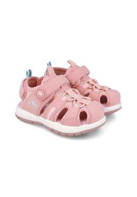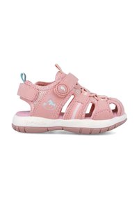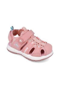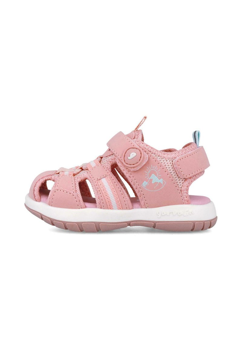 Sandales pour enfants roses au design ouvert, avec une sangle réglable, une semelle en caoutchouc et un dessus texturé avec un motif de soleil. Légères et respirantes.