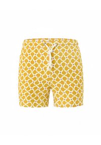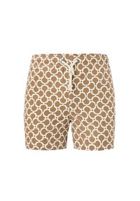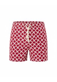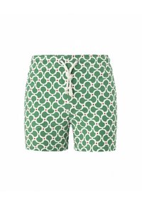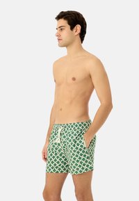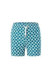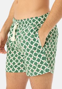 Jeune homme aux cheveux courts et foncés portant un short de bain vert à motifs avec un cordon blanc, debout les mains dans les poches, faisant face à gauche.