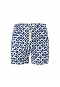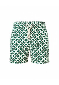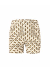Homme torse nu à la peau claire et aux cheveux bruns, portant un short de bain beige et blanc à motif losange avec un cordon de serrage, debout devant un fond uni.
