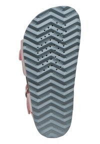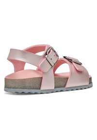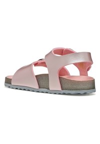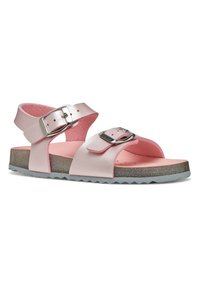 Sandale à bout ouvert métallisée rose avec deux boucles argentées réglables, semelle rembourrée et semelle extérieure grise texturée.