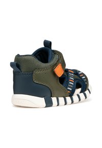 Sandale sportive pour enfants avec mesh bleu marine et vert olive, détail de bride orange, semelle blanche segmentée et fermeture à scratch.