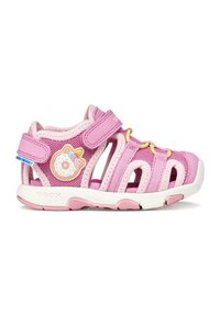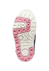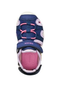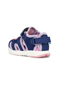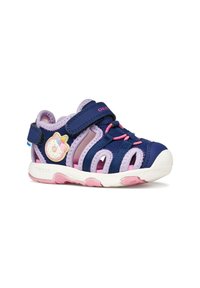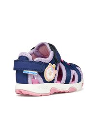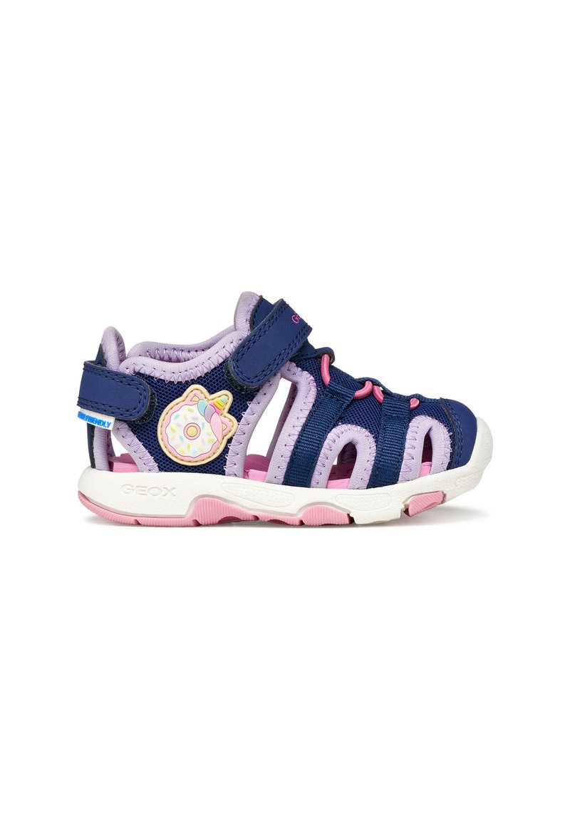 Sandale pour enfants bleu marine et lavande avec accents roses, côtés ouverts, brides ajustables et un patch licorne en forme de beignet sur le talon.