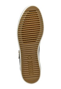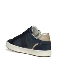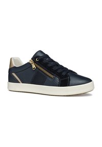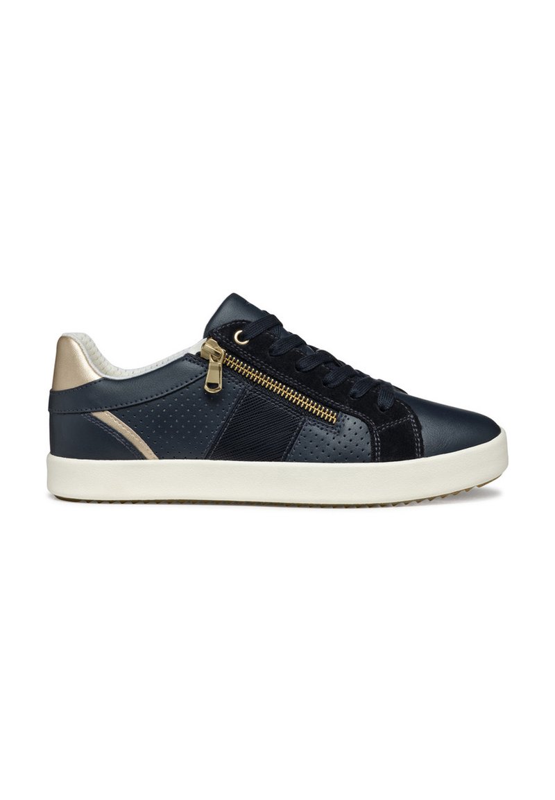Baskets en cuir marine avec accents dorés, design perforé et fermeture éclair sur le côté. Présentent une semelle en caoutchouc blanche et un tissu texturé sur les côtés.