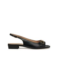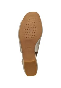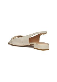 Sandale blanche en cuir à bride arrière avec un talon bloc bas, bout ouvert, bride à boucle réglable et boucle décorative dorée à l'avant.