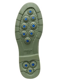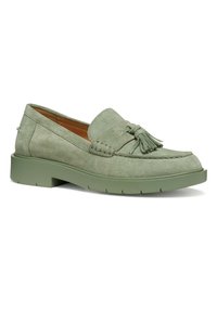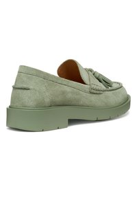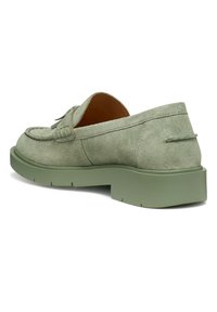 Mocassin en daim vert clair avec détail à pompons, accents cousus et semelle épaisse en caoutchouc, présenté de profil sur un fond blanc.