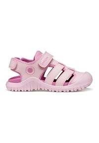 Sandale fermée rose pour enfants avec des sangles réglables, semelle en caoutchouc et étiquette "compatible avec l'eau" sur fond neutre.